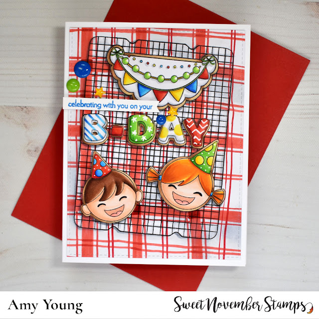 This past Saturday I did a Live coloring using the new digital stamp release at Sweet November Stamps called, Birthday Cookies. They are just the latest addition to our popular cookie themed digi line-up and they really do make for the sweetest birthday cards out there. For this card I combined the party bunting and boy cookie from Cookie set 2 with the girl cookie from Cookie set 3. I also brought in the older alphabet set and the cooling rack for them all to rest on. It was suggested early on in the Live that we go with a fun primary color scheme that harkens back to those classic birthday parties from a time before the popularity of themed parties. I gotta say, I don't pull out the primaries to work with very often so this was a fun change of pace and I think the end result definitely has a kind of retro vibe to it which is so cute!