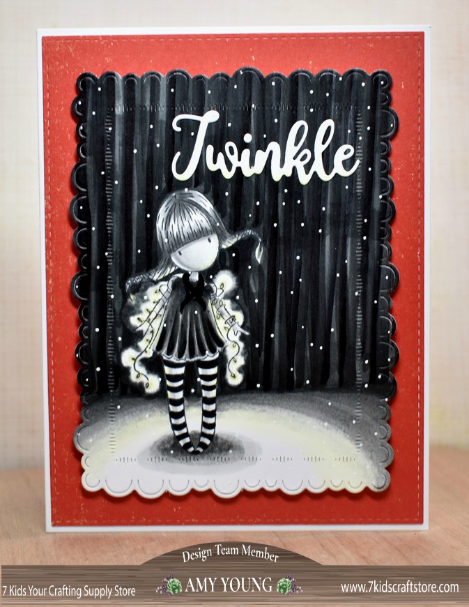 I'm back posting for 7 Kids today and I've even got another Gorjuss Girl that I inked up. This time I grabbed one of the minis to play with and ended up with something a bit different. This is actually my second attempt at coloring up Miss Fairy Lights but after my first full color version ran into a series of unfortunate events I decided to take a cue from classic Christmas movies and go black and white. Not only did this save me time in the re-color but it also lent a very dramatic effect to the over all card design which turned out kinda cool. It's hard to tell in the photo but I did add a touch of very light yellow glow to the lights which stands out nicely in person.